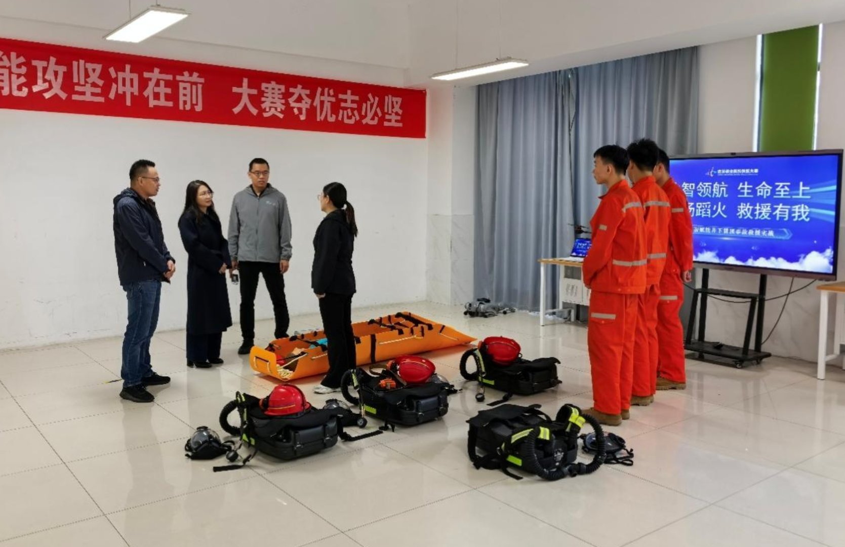 座谈会后,城市安全学院一行人参观了盐城市经贸高级职业学校2025年世界职业院校技能大赛总决赛排位赛集训点,现场观摩学生 "智慧领航、生命至上、赴汤蹈火、救援有我" 的实战化井下冒顶事故救援训练。