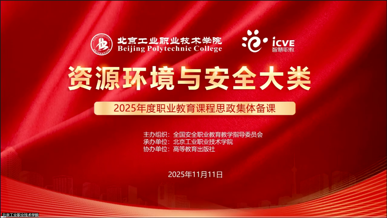为深入贯彻习近平总书记关于思政课建设的重要论述及“大思政课”重要指示精神,落实《教育强国建设规划纲要(2024—2035年)》要求,推进职业教育资源环境与安全大类课程思政高质量建设,11月11日,由全国安全职业教育教学指导委员会主办、北京工业职业技术学院承办、高等教育出版社协办的2025年度职业教育资源环境与安全大类课程思政集体备课会在北京工业职业技术学院顺利召开。会议以“夯实安全特色,坚持课程思政与专业课程同向同行,打造课程育人功能”为主题,采用“线上+线下”结合形式,吸引全国职业院校领导、专家、课程思政示范团队及任课教师1200余人参与。