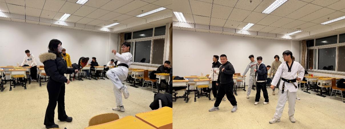 “晚二课”注重学生身心协调发展。学院邀请跆拳道社团走进电气2531班和安管2531班,开展专项体验教学。社团成员进行了专业细致的讲解,向同学们普及了跆拳道的基础步法、拳法与防守技巧,并结合动作示范拆解技术要领。在一对一指导环节中,社团同学耐心纠正动作细节,帮助大家掌握发力技巧,鼓励同学们大胆尝试。此次教学不仅让同学们领略到跆拳道的魅力,增强了体魄,也培养了专注力与坚韧意志,丰富了晚间的课余生活。
