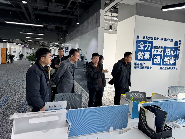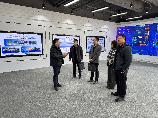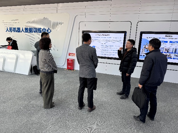 在孙冬的引导下,调研团队首先参观了中心一层展区,系统了解了中心的发展背景、建设目标及运行模式,重点听取了关于通用人形机器人本体、真实场景训练、链企共建等方面的介绍。随后,调研团队深入智能制造、商务服务、家庭服务等多个应用场景训练区,现场观摩典型仿真训练场景,详细了解了人形机器人在真实环境下从数据采集、清洗、标注、验证到质量评估的全链条标准化流程,对数据驱动下的人形机器人训练体系有了直观而深入的认识。