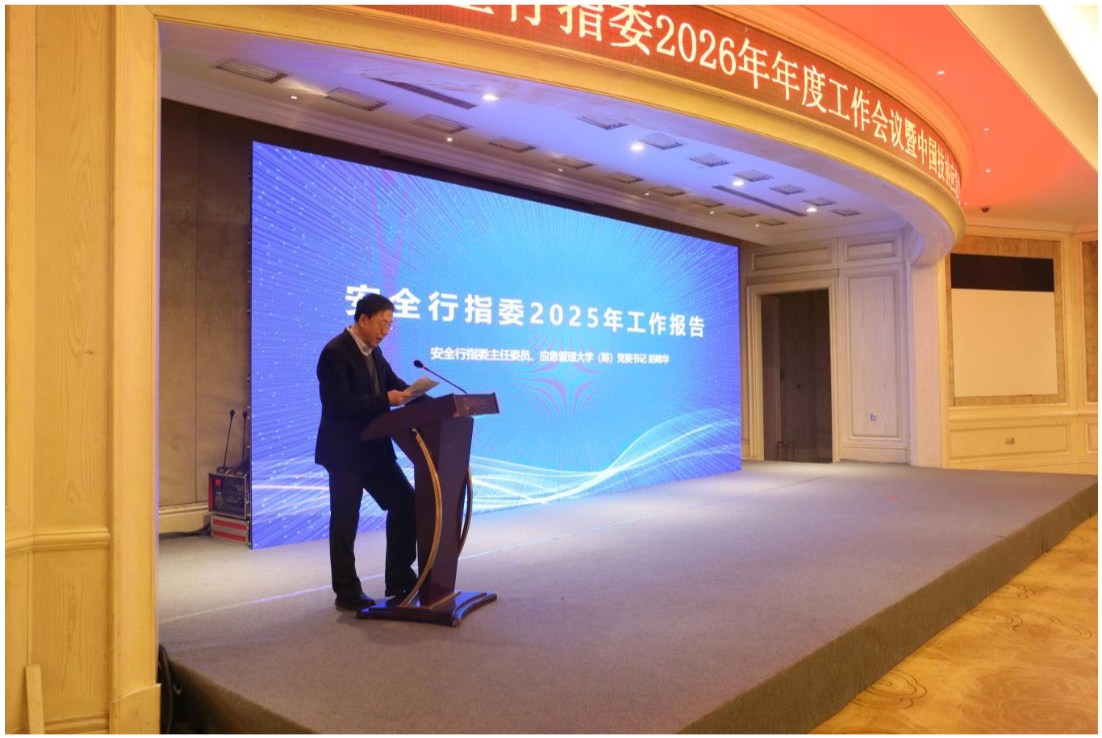 1月12 日上午,会议在全体与会代表奏唱中华人民共和国国歌声中开幕,随后集体观看了党的二十届四中全会精神宣传视频。会议由安全行指委秘书长、应急管理大学(筹)安全工程学院党委书记马汉鹏教授主持。安全行指委主任委员、应急管理大学(筹)党委书记赵峰华教授做工作报告,从强化组织引领、深化教学改革、突出以赛促教、聚焦科研引领、打造特色品牌、增强服务职能等六个方面总结 2025 年工作,明确 2026 年将以深化产教融合、科教融汇为主线,强化内涵建设、提升培养质量的核心任务。会议期间还举行了新一届专门委员会委员聘任仪式,赵峰华主任委员为新聘任的消防救援专门委员会主任委员霍江华颁发聘书。